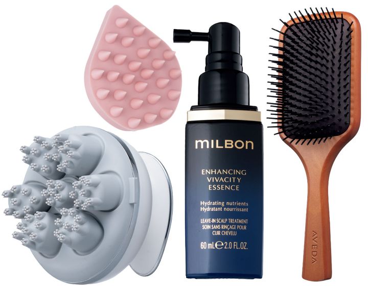 (左から)5つの有効成分であらゆる脱毛要因にアプローチ。ミルボン エンハンシング ビバシティエッセンス[医薬部外品]60ml ¥6,600(ミルボン、美容室専売品)頭皮のツボを刺激しコリをほぐす。リラクシングマッサージブラシ マットピンク¥1,925(エトヴォス)