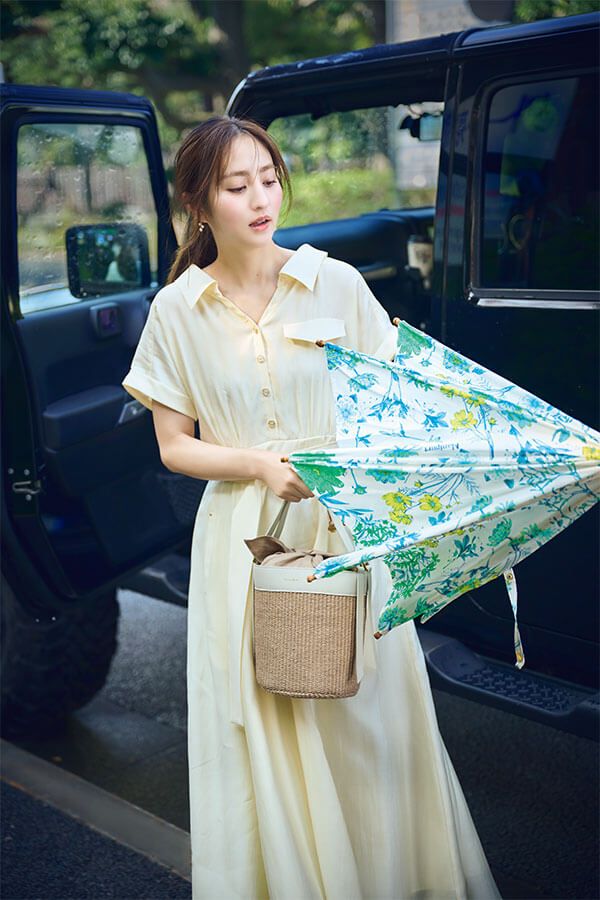 レイニーシーズンのドライブデートには、清涼感と女性らしさを兼ね備えた淡いイエローカラーのシャツワンピをチョイス。ロイヤルな華感が魅力のカラフルな花柄傘でおめかし感をトッピング。
