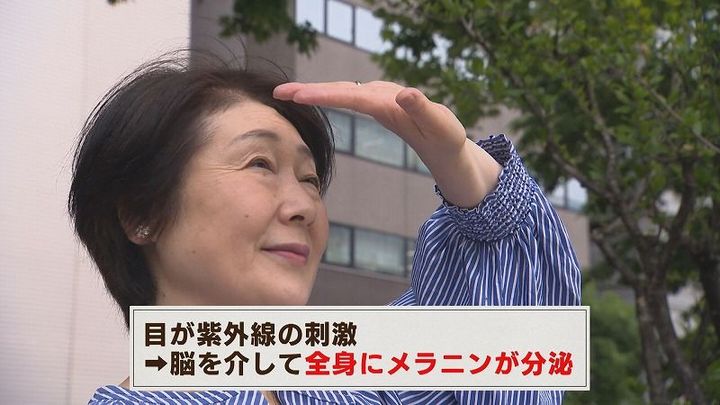 當瀬教授:「目の中に紫外線が入ってくるのですが、通常その紫外線が網膜に影響すると、脳の神経を介して皮膚にメラニン色素をたくさん作れと命令がでることなっているんですよ。体全部をカバーして、目にだけ紫外線を当てても色は黒くなるっていうのは人間の仕組みにあるんですね」