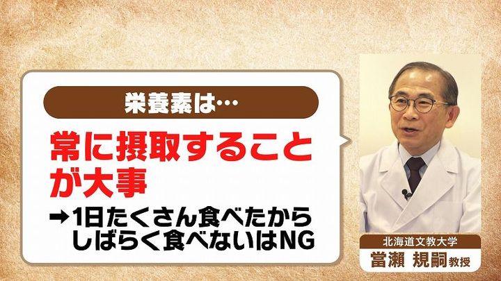 溜まることもできないので、今日一杯食べたから『しばらくは食べなくて大丈夫』ということはないので、 毎日の食事のバランスが大事 とのことです。