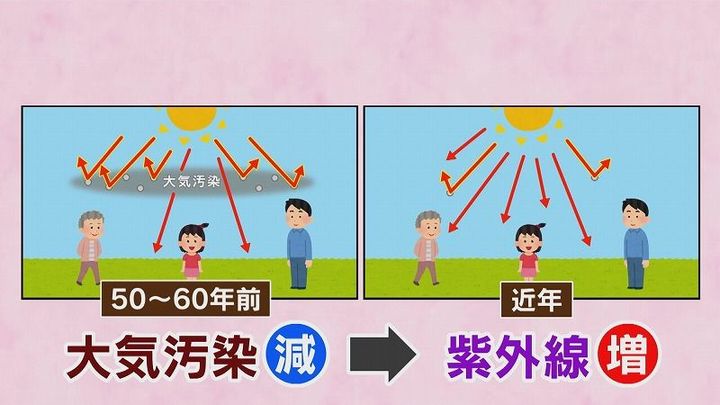 當瀬教授:「そういう時って、紫外線がそれにぶつかって地上まで落ちてこないんですよ。それが今、公害とか大気汚染の対策が進んできて空気が澄み切ってきているので、太陽からの紫外線が増えたというワケではなくて、途中でカットされる紫外線の量が減ったので」