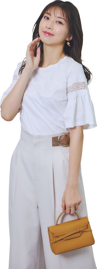 Tシャツ¥12,100/ストロベリーフィールズ(シュガー・マトリックス) パンツ¥20,900/ジャスグリッティー イヤリング¥2,640/アネモネ(サンポークリエイト) バッグ¥31,900/トーヴ(アンソロジー)