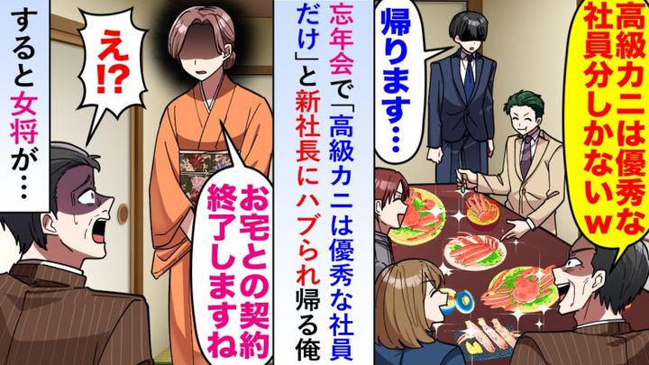 「高級カニは優秀な人だけ」ミスを押し付けられ忘年会でひどい扱いを受ける僕。すると女将が衝撃のひと言