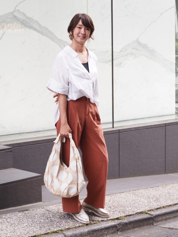 胸元がざっくり空いたゆったりシルエットの白シャツに合わせたのは、夏の装いにマッチするテラコッタカラーのパンツ。「『ジーユー』のセール品から掘り出し物を見つけてコーディネートに取り入れるのがマイブームです」。コスパはもちろん、着心地よし、形よしのアイテムを見極める審美眼がお見事! カラーアイテムを一点使いすることで、メリハリのある着こなしに。