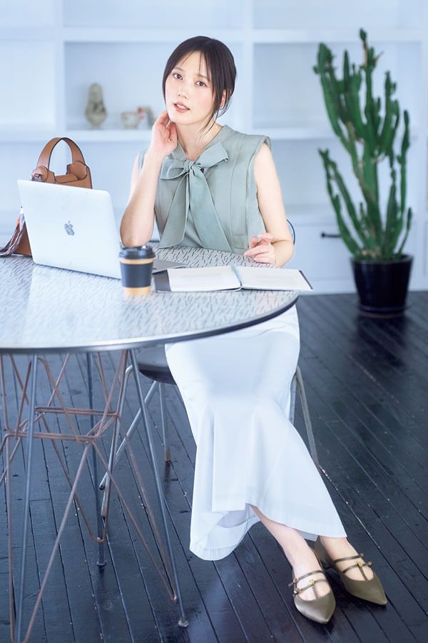 角が立つフォルムのリボンと端正なホワイトのマーメイドスカートで、女性らしさと知的さを両取り。