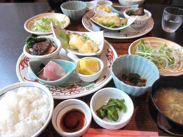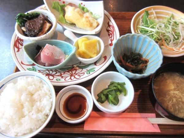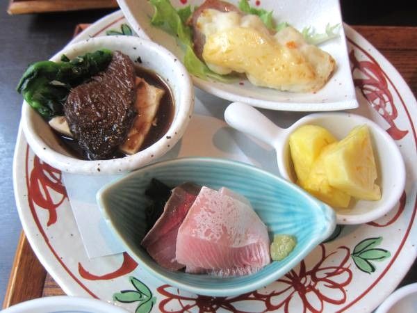 お造りの鰤は、分厚いカットで食べ応えがありました。豚ロースのポテト焼きは、ボリュームありです。お豆腐とお魚の煮物は、よく煮込まれてこっくり美味しかったです。パイナップルは、甘かったですよ~。