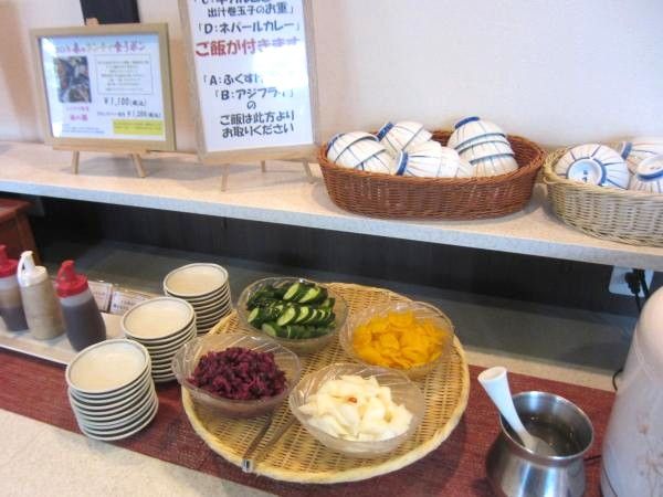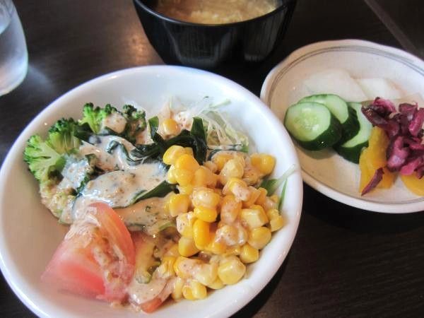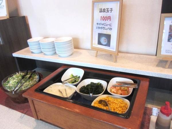 サラダバーコーナーには、サラダ・お漬物・ごはん・スープがあります。