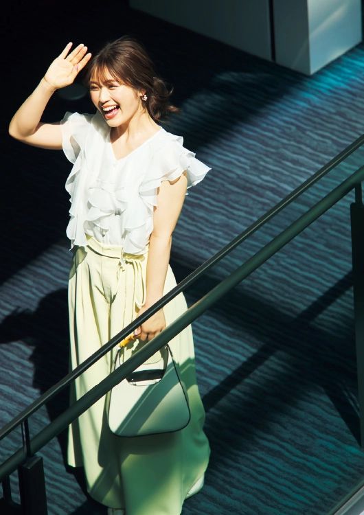 ラッフルフリルのボリュームと、小さなV開きですっきり見える首元とのバランス感がよくきれい見えするブラウス。フレアパンツと合わせてXラインを作り、くびれをアピールするとスタイルアップも可能。