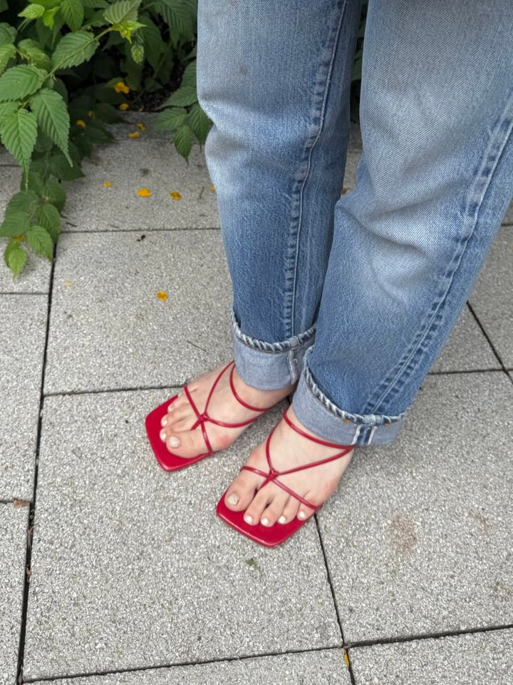 「Ameriの赤いサンダルは繊細なラインが女性らしくて気に入っています。パキッとした赤色が可愛くて、華奢なデザインながらも存在感があるアイテム。今日はELCHELEのビジューベストをポイントに、ビビッドなカラーのサンダルを合わせて、コーディネートの全体感を引き締めました。デニムはヴィンテージのリーバイス501で、リメイクの巻きスカートをレイヤードすることで腰まわりをカバーし、メリハリのあるシルエットに仕上げています」