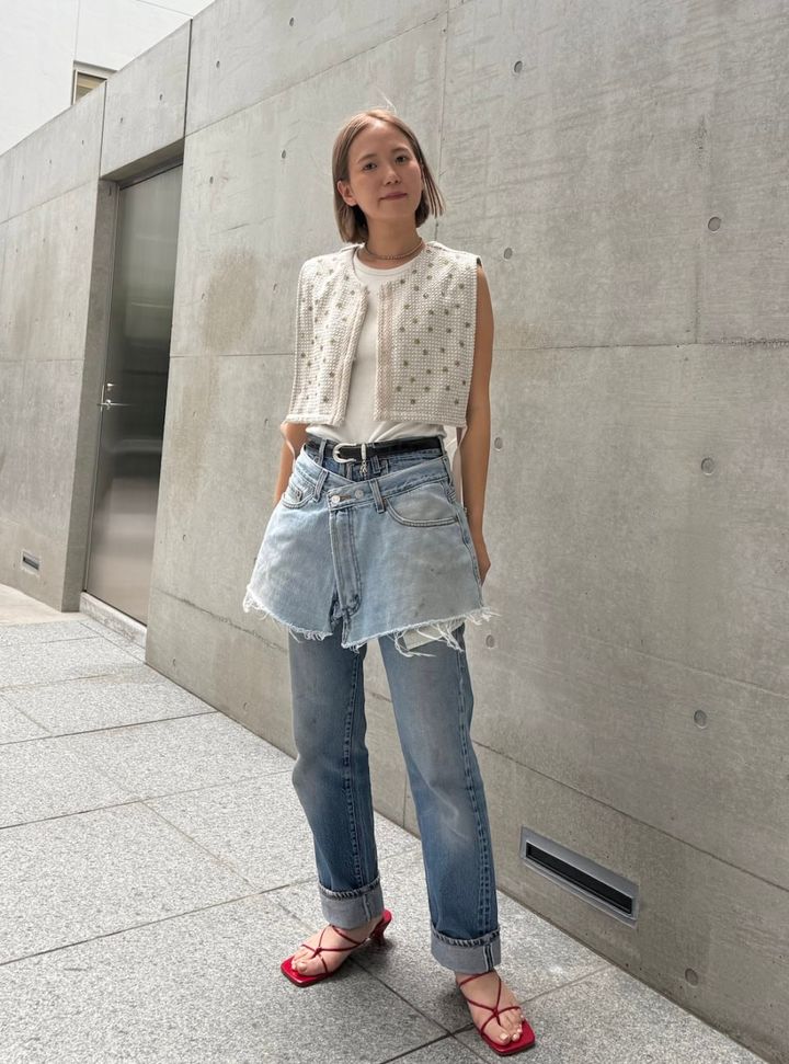 サンダル¥20,350(アメリ)、ベスト¥16,500(エルチェレ)、古着をリメイクしたデニム巻きスカート、リーバイスのヴィンテージデニム、その他は全て本人私物