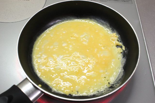 5. フライパンにサラダ油を引き、中火で熱します。片栗粉を加えた溶き卵を、薄く流し入れて焼きます。焼き上がった薄焼き卵は、千切りにします。
