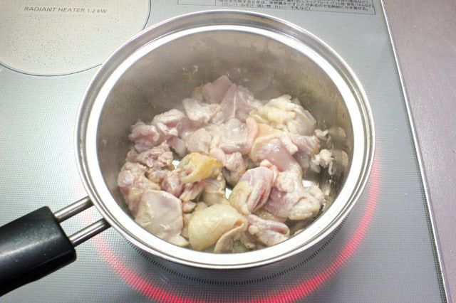 2. 鍋にオリーブオイルを引き、中火で熱します。鶏もも肉を小さめのひと口サイズに切って入れ、焼き色を付けます。
