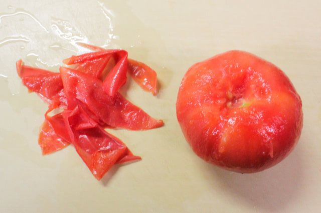 トマトは、そうめんのつけだれの具にするので、皮をむいて口当たりをよくします。湯むきしてから、食べやすい大きさでざく切りにしました。