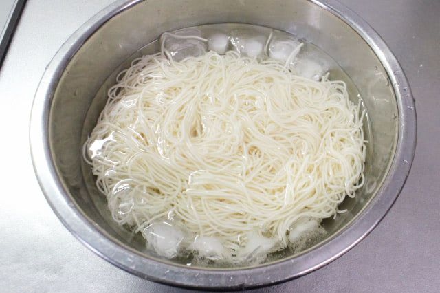 7. そうめんを1分30秒~2分茹で、流水でぬめりを取ってから氷水で冷やします。