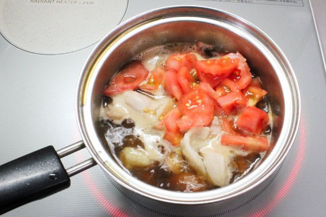 3. 2にめんつゆ、水、1のトマトを加え、弱火で3分ほど煮込みます。