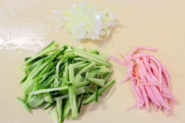 6. きゅうりとハムを千切りに、長ねぎをみじん切りにします。
