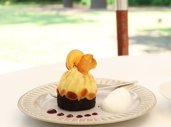 殿下居間に飾られていたレイモン・シュブの名作「テーブル・ランプ」をイメージしたスイーツです。 「柔らかな甘さのクリームと竹炭クランブルの深い陰影で、アール・デコの光と陰」を表現したそうです。 柔らかなランプの灯りを思わせるクリームの甘さでした。