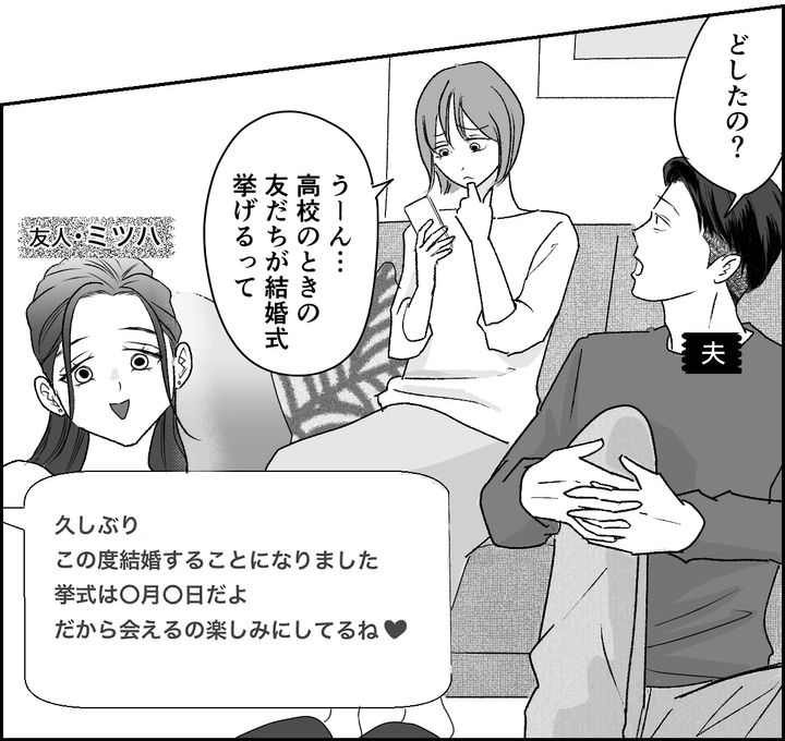 私はサトコ。2年前に結婚して、今は夫のナオヤと2人で暮らしています。さてある日のこと、1通のLINEが届きました。差出人はというと、高校時代に仲良しグループの1人だったミツハでした。ミツハとは高校を卒業してからずっと疎遠になっていたため、正直驚いてしまいました。内容を読むと、なんと結婚式を挙げるから来てほしいというもの。友人ですから結婚自体はおめでたいと思えるのですが、式に出るのは迷ってしまいます。