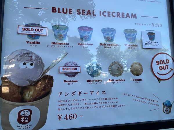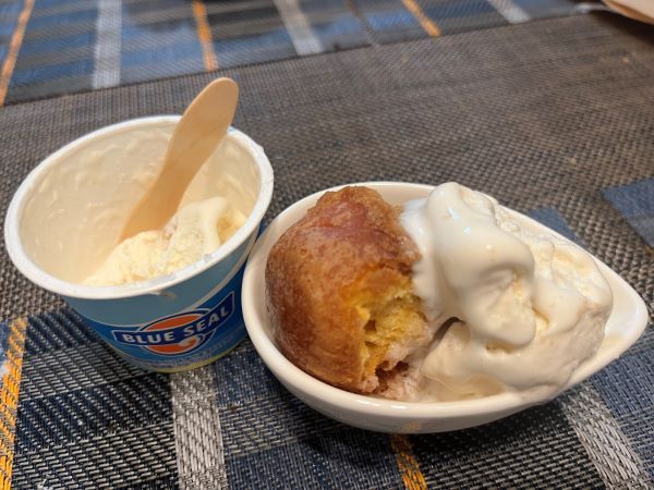 もうひとつのおたのしみのブルーシールアイスはアンダギーと組み合わせていただきました。 店員さんにおすすめを聞き、プレーン味のアンダギーと塩ちんすこうのアイス(370円)を購入。