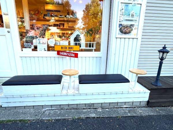 きれいにトッピングできなかった・・。でも、ふわっと軽いアンダギーにひんやりアイス。アンダギーアイス最高!! アンダギーもアイスも種類豊富で色んな組み合わせ楽しめそうです♪ テイクアウトでなければ、かわいいカップでいただけます。 お隣のペット用品の前にはかわいいベンチもあります。ゆっくり♪