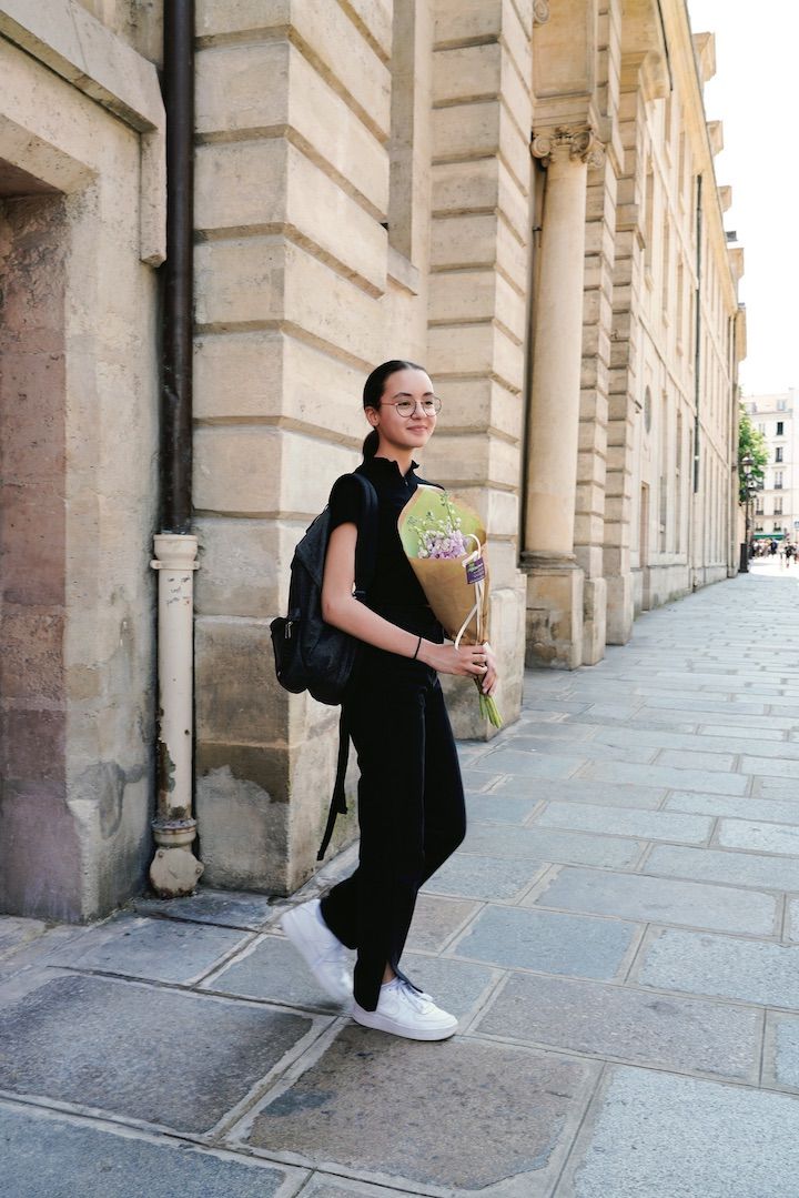3. オールブラックのコーデは足元を白いスニーカーで爽やかに