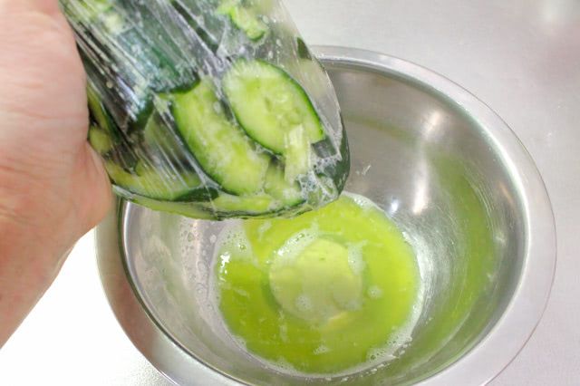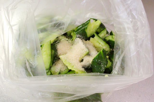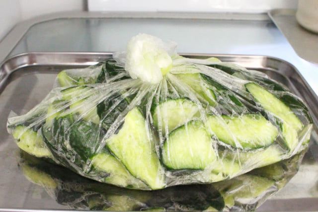袋の上から揉むと、きゅうりの断面が多いのでとてもやわらかい手触り。砂糖で揉んでも、塩揉みした時と同じようにきゅうりの水分が出てきました。