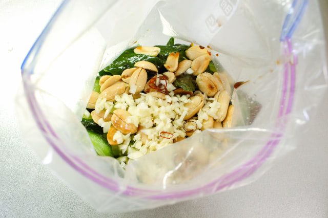 別の袋に水分を絞ったきゅうり、しょうゆ、酢、オイスターソース、砂糖、にんにく、うま味調味料、にんにく、輪切り唐辛子、油ごとの炒りピーナッツを入れました。