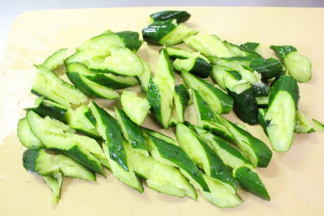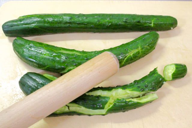 1. きゅうりの両端を少し切り落とし、麺棒などで叩いて斜めに切ります。
