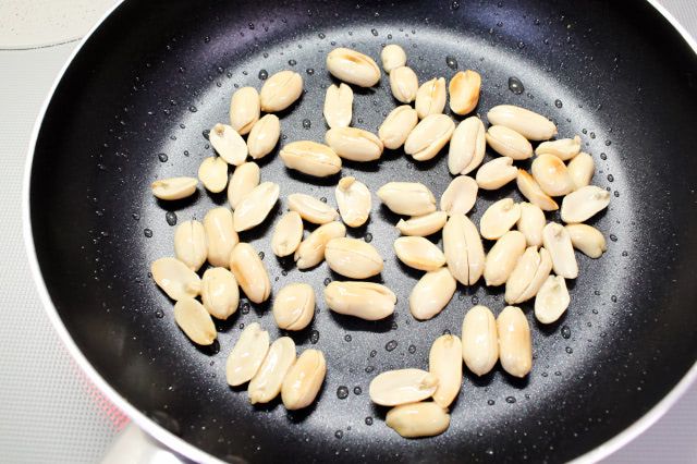 4. サラダ油を引いたフライパンを弱めの中火で熱し、ピーナッツが軽く色付く程度に炒めます。
