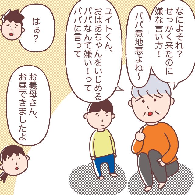 アツシの「帰って欲しい」という言葉を聞くと、急に義母は『かわいそうなあおばあちゃん』を演じ始めました。「なによそれ?せっかく来たのに嫌な言い方!パパ意地悪よね~」いつものように、ユイトに話す体で聞こえよがしに「ユイトくん、おばあちゃんをいじめるパパなんて嫌い!ってパパに言って」と言いましたが、まぁいつものことなのでアツシは「はぁ?」とあきれ顔、私もスルーで「お義母さん、お昼できましたよ。」と声をかけました。