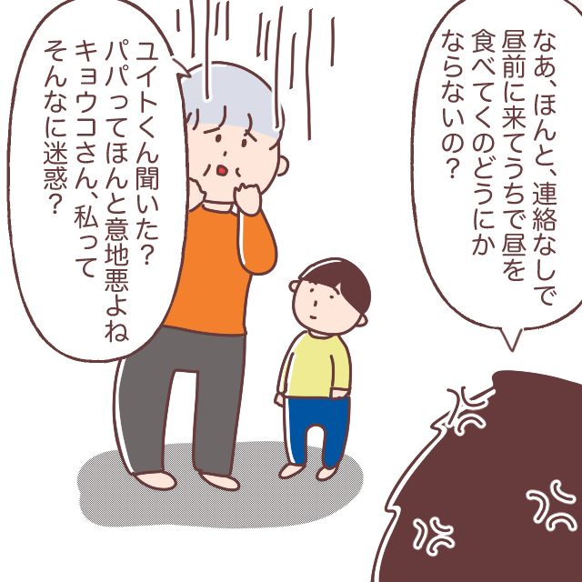 私が義母のお昼も準備したことを知ったアツシは「なぁ、ほんと、連絡なしで昼前に来てうちで昼を食べてくのどうにかならないの?」と、またしても私の気持ちを代弁してくれました。義母は「ユイトくん聞いた?パパってほんと意地悪よね。キョウコさん、私ってそんなに迷惑?」