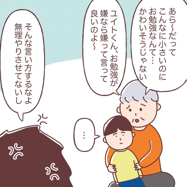 「こんなに小さいのにお勉強なんて、かわいそうじゃない。」と言って、義母はユイトに「お勉強が嫌なら嫌って言っていいのよ~」と諭すように言いました。たのしくひらがなを覚えていたユイトはきょとんとしています。自分の考えを押し付ける義母に夫アツシが「そんな言い方するなよ。無理やりさせてないし」と言ってくれましたが。