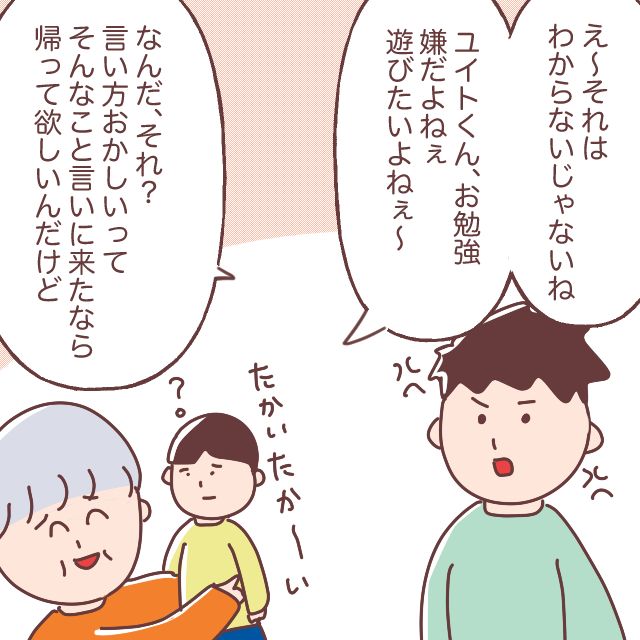 「え~それは分からないじゃないね。ユイトくん、お勉強嫌だよねぇ。遊びたいよねぇ~。」と、半ば言い聞かせるようにユイトに話す義母には、私たち夫婦の考えが通じません。アツシもイラッとして「なんだ、それ?言い方おかしいって。そんなこと言いに来たなら帰って欲しいんだけど。」と、私が言いたくても言えないことを全部言ってくれました。