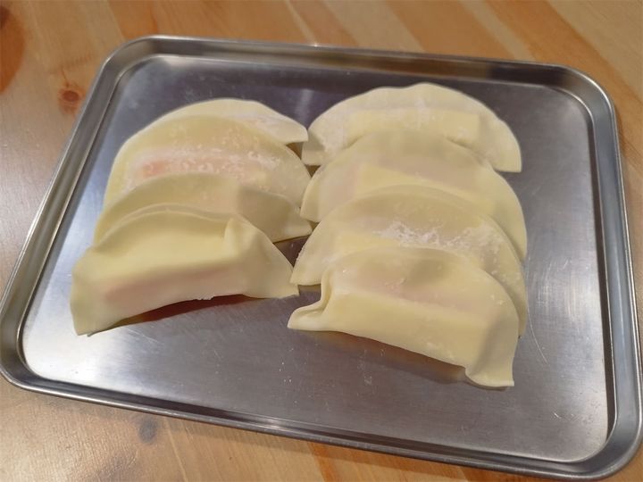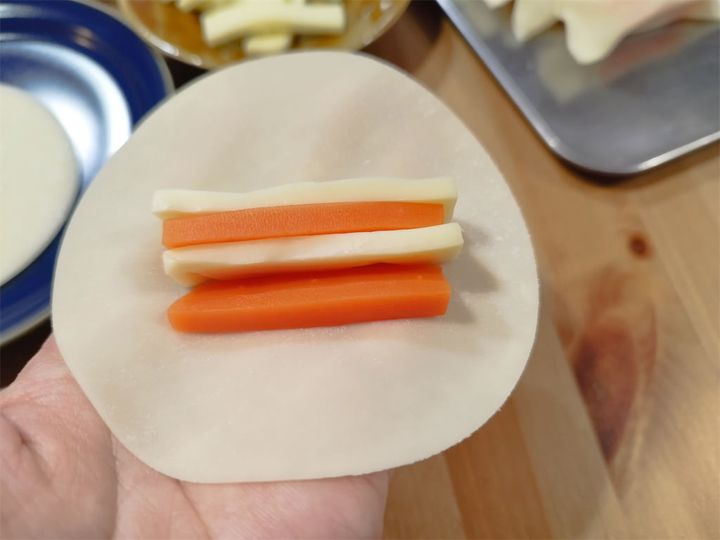 4. 餃子の皮に、にんじん、チーズ、にんじん…と交互に並べて形を整え、最後に餃子の皮に水(分量外)を付けて止める。