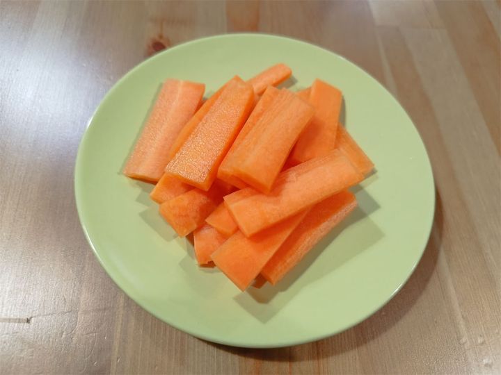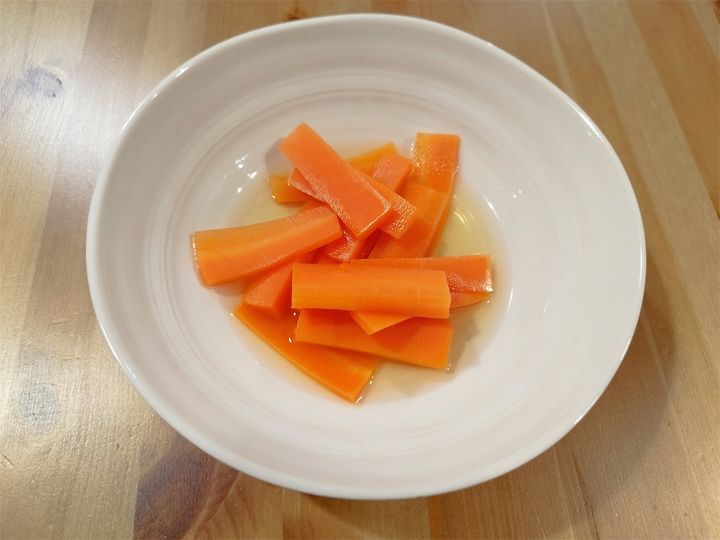 1. にんじんを5cm×4mmの大きさに16本切る。