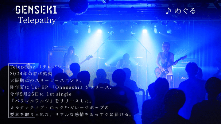 2024年春に始動した、大阪を拠点に活動するスリーピースバンド、Telepathy。ギター/ヴォーカル担当あのさつき、ベース/コーラス担当おかもとなな、ドラム担当きどあまねで構成。5月25日に1st single「パラレルワルツ」をリリースしました。オルタナティブ・ロックやガレージポップの要素を取り入れ、リアルな感情をまっすぐに届けます。