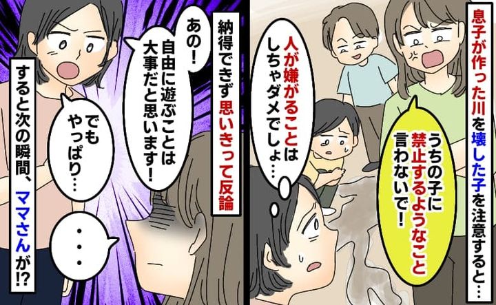 私はその子に「何年生?」と聞くと「1年生」と言うので、息子と同い年か……されて嫌なことはわかる年頃だなと思い、「一生懸命作ってできあがったばかりだから、壊したら悲しいな」と伝えました。すると、近くにいたその子のママがムッとした表情で私を睨みつけながら、「このイベントでうちの子に禁止するようなこと言うって、どういうことなん?」と言ってきました。私と息子は驚きながら沈黙。たしかに子どもの遊びに口出しをしてしまったことは反省しましたが、どうしてもモヤモヤが消えません。涙をこらえながら崩れていく川を見つめている息子を見て、やっぱり私は心が痛みました。