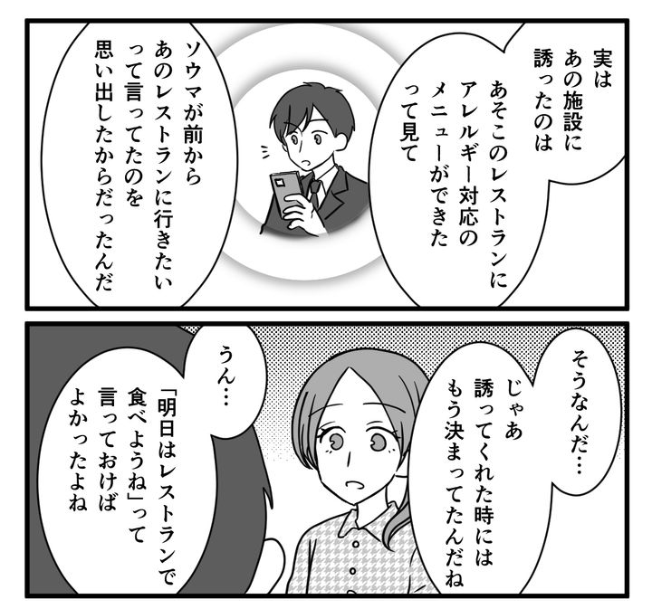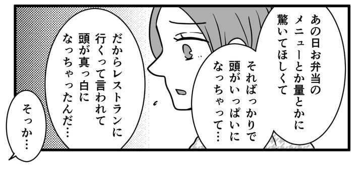 私はムツキ。旦那のイオリの提案で、息子のソウマが大好きなレジャー施設に家族3人で出かけることになりました。早起きをしてお弁当を作ったのに、お昼になると旦那と息子はレストランでお昼ごはんを食べると約束をしていたと言い出したのです。一応お弁当は帰宅してから夜ごはんとして3人で食べましたし、旦那も謝ってくれましたが、それでも私の気持ちは収まりません。パート先の同僚・シホちゃんに愚痴を聞いてもらうと……私にも落ち度があったと気づいたのです。独りよがりな考え方をしていた自分が恥ずかしくなってしまいました。旦那にちゃんと謝ろうと思います。