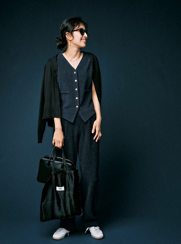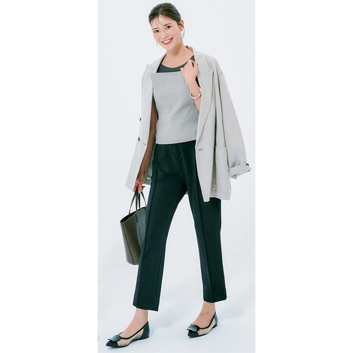 もはやファッションのテイストを問わず「美脚黒パンツ」は永遠の必携アイテム。トップスを選ばず、どんなシーンにも対応できる万能ぶりも唯一無二です。サマーニットにビスチェをレイヤードしてひと技効かせると定番パンツが今どきな装いに。さらにジャケットを羽織れば大切なプレゼンにも自信を持って挑めそう。凛としたシルエットがきちんとした印象を後押ししてくれます。