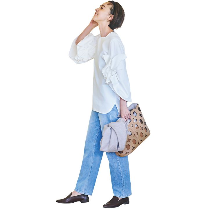 デニムOKな職場であっても、オフの日とは服装を切り替えたいもの。オフィスではキレイめトップスを着て、足元もローファーでシャキッとさせて。同じデニムでも、気持ちがキリッと切り替わります。
