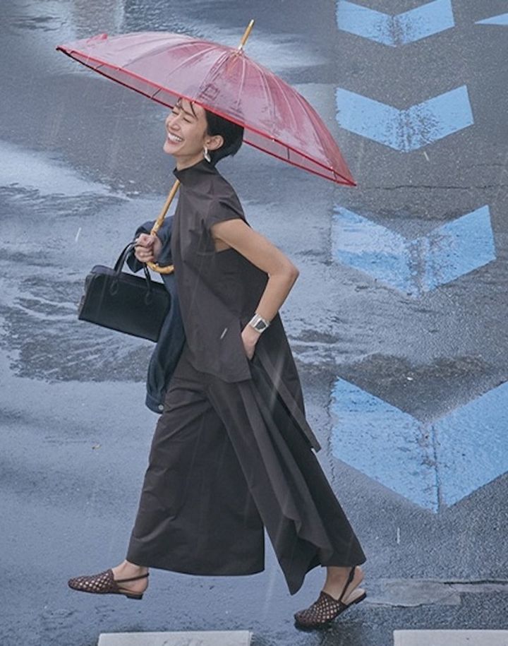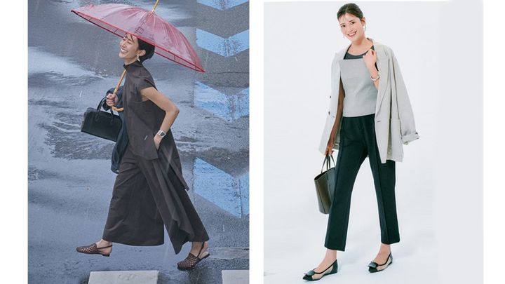ジメジメ蒸し暑い日に選びたくなるのは、フレアスカートのような華やぎと、足捌きや通気性の良さを両立した快適ワイドパンツ。セットアップなら、ワンピースのようなドレッシーさも。気が重くなる雨の日の通勤や送迎も、エレガントかつスマートに乗り切れそう!この夏注目のブラウンで全身をまとめるのも今っぽさアップのコツです。