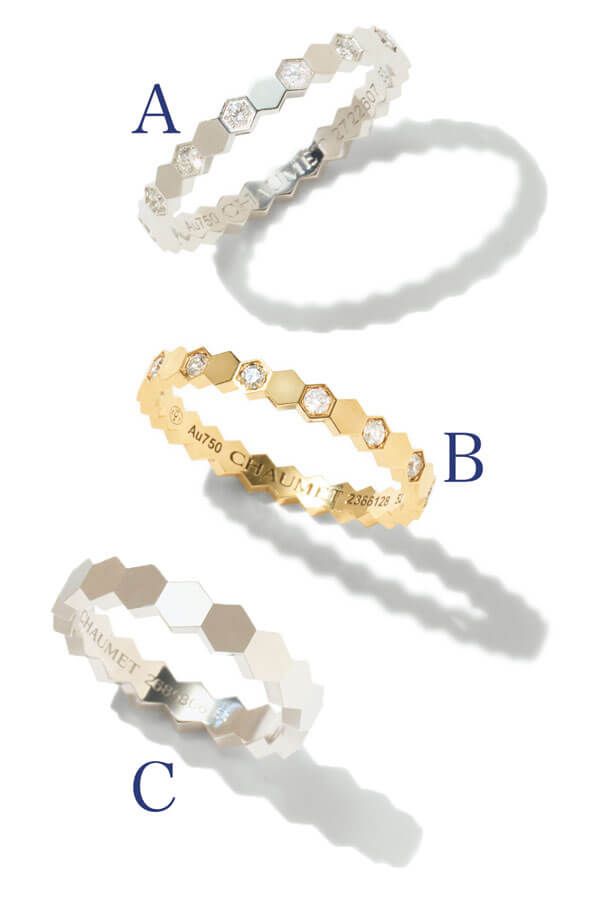 Aリング(右手薬指下)[WG×DIA]¥476,300、Bリング(右手薬指上)[YG×DIA]¥451,000、Cリング(右手人差し指)[WG×DIA]¥364,100/以上ショーメ
