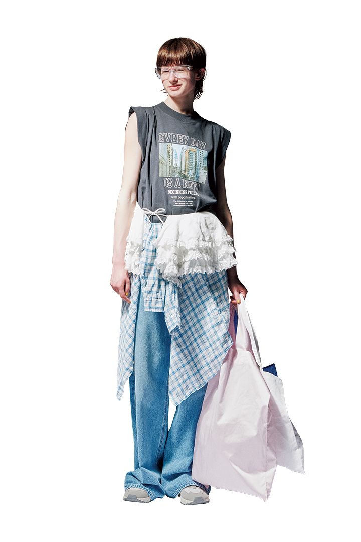 「ユニバーサル・スタジオ・フロリダ」のキャラクターがプリントされたTシャツを要に、デニムをドッキング。耳にはヴィンテージの大きなピアス をつけて、ポップとクラシカルの間を駆け抜ける。