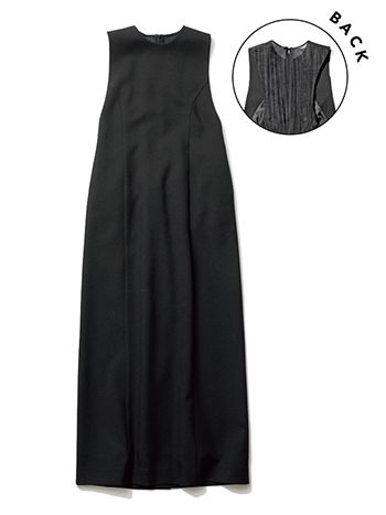 バックシアーマキシワンピース/クラネ(クラネデザイン) 端正なIラインを飾るように、2つの素材をドッキング。背面は光沢をともなった透け感がありドレッシーに。