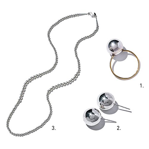 1.シルバー×ゴールドリング/e.m.(e.m. 青山店) リング部分は肌にとけ込むゴールド。 2.ボールシルバーピアス/quipqueint(フーブス) 一粒パール感覚で。 3.シルバーロングネックレス/quipqueint(フーブス) 粒違いを等間隔でMIX。