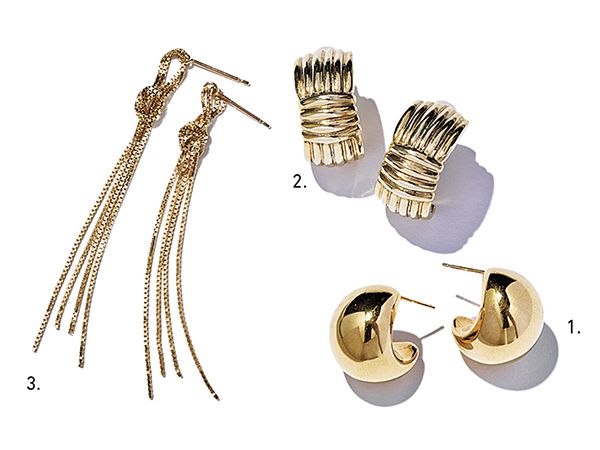 1.ゴールドぽってりピアス/ココシュニック オンキッチュ(ココシュニック) 2.ゴールド大ぶりイヤリング/IRIS47(フーブス) 編み目を表現。 3.ゴールドノットフリンジピアス/ココシュニック 動くたび繊細な輝きを放つ。