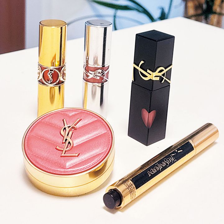 YSLのリップはすべてが好み。 ルージュ ヴォリュプテ シャイン 153は、大切な日の1本。ラブシャインの209はゴールドパール系。ザ インクス ブラークリーム 44はソフトマット。長年リピートの筆ペンタイプのコンシーラー&ハイライター。パケ買いしたパウダーチークは44 ピンク。