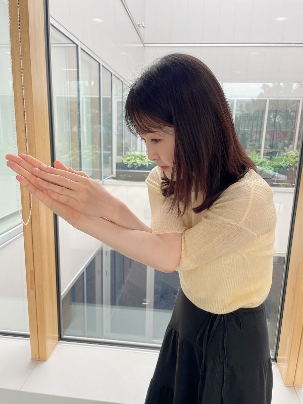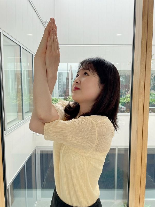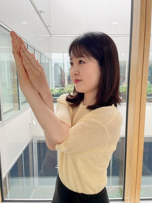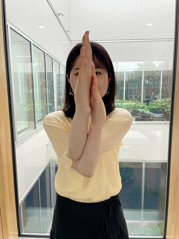 ② 親指を自分の顔のほうに向けたまま両手のひらを合わせる。