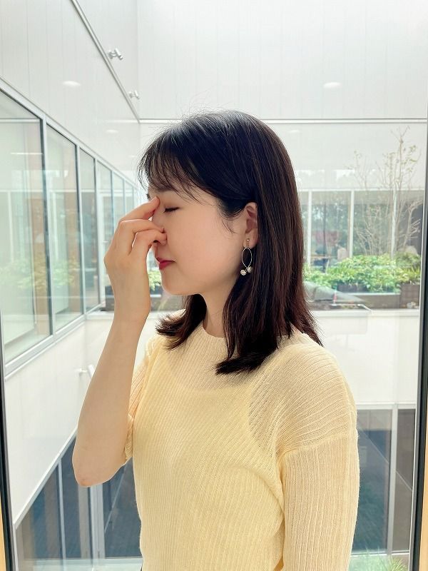 ① 目を軽く閉じて、右手の人差し指と中指を眉間に当てて、薬指と小指は左鼻に、親指は右鼻に添える。