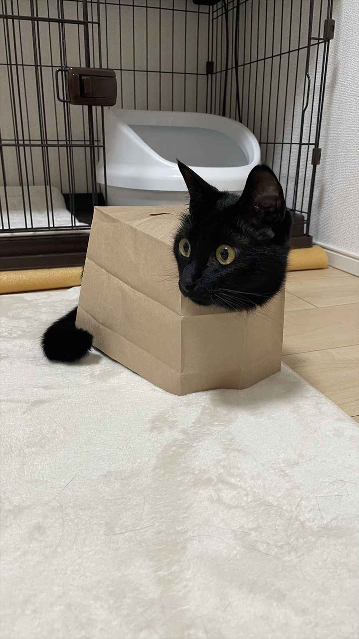 黒猫が紙袋にすっぽり!正真正銘の香箱座り?をしている姿が話題に「良い香箱ですね」「想像以上に箱」